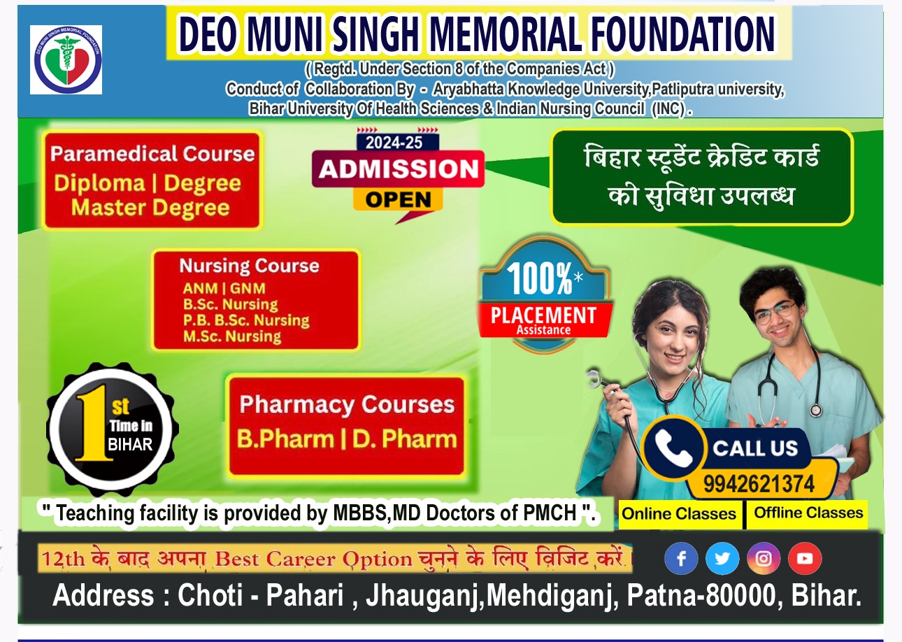 Deo Muni Singh Memorial Foundation a Mission to Serve the Society for Health Sector in BIHAR. Being associated with Deo Muni Singh Foundation (Raged. Under Section 8 of the Companies Act), which has a Glorious established last year 2023. this Trust provides the Best-in-class Education, BIHAR STUDENT CREDIT CARD Facility and Training facilities with placement to the students. Our Foundation is situated in Choti-Pahari,Jhauganj, Mehdiganj. Patna, Bihar.